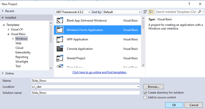 Informe o nome da solução como Slide_Show e clique no botão OK;