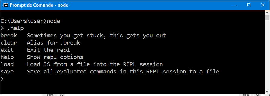 Finalmente digite node para entrar no REPL e seguir digite .help para ver opções de comandos disponíveis :