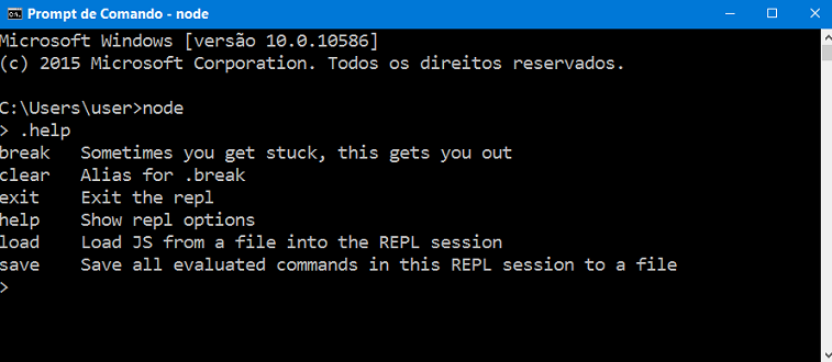 Para o usar o terminal basta abrir um prompt de comando (No Windows 10 digite cmd.exe) e a seguir digitar : node e teclar Enter: