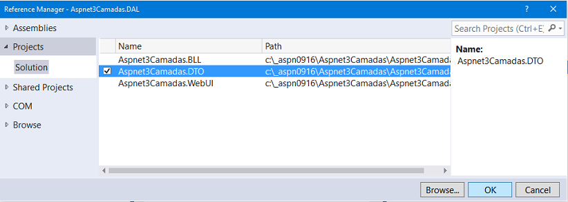 Na janela Add Reference clique em Projects e a seguir marque os projetos Aspnet3Camadas.DAL e Aspnet3Camadas.DTO.
