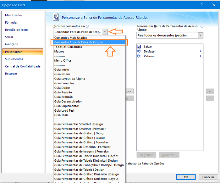 2 - Na janela Opções do Excel abra as opções: Escolher comandos em : da caixa de combinação e selecione a opção Comandos Fora da Faixa de Opções...