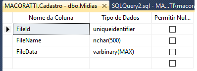 Os arquivos de áudio e vídeo serão armazenados na tabela Midias no banco de dados Cadastro.mdf que possui a seguinte estrutura: