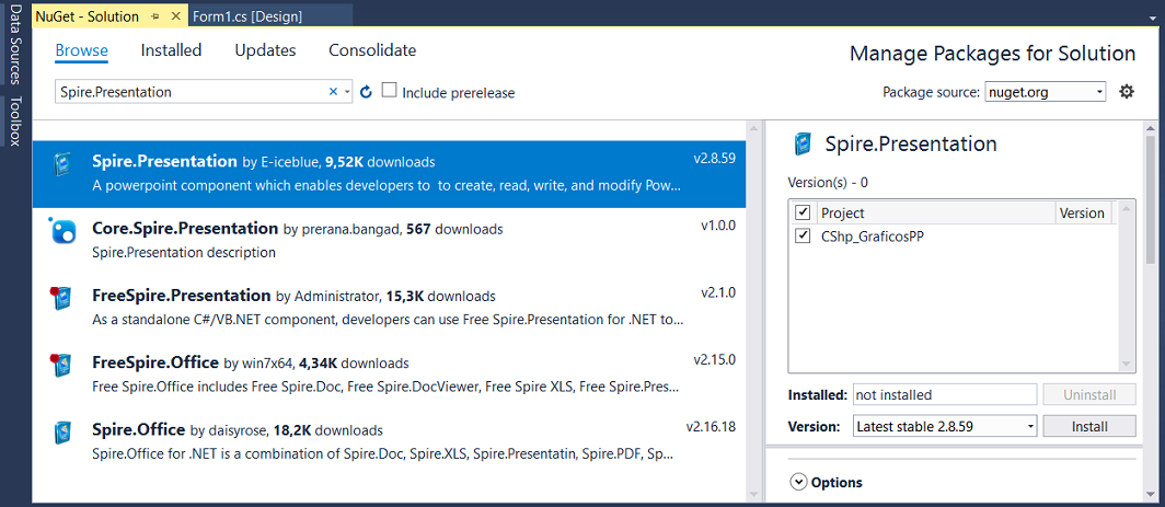 Após criar o projeto vamos incluir a referência à biblioteca Spire.Presentation via Nuget.