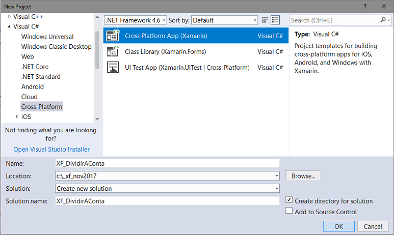 Selecionando o template Cross Platform App (Xamarin), informando o nome XF_DividirAConta e clicando em OK;