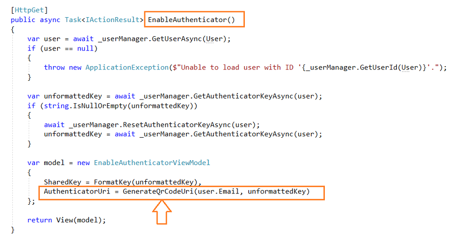 Agora você vai clicar no botão - Add authenticator app - e isso vai chamar o método EnableAuthenticator(Get) do controlador ManageController que vai chamar internamente o método GenerateQrCodeUri: