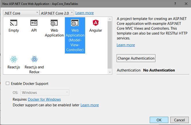 A seguir marque o template Web Application(Model-View-Controller), sem autenticação e clique no botão OK;
