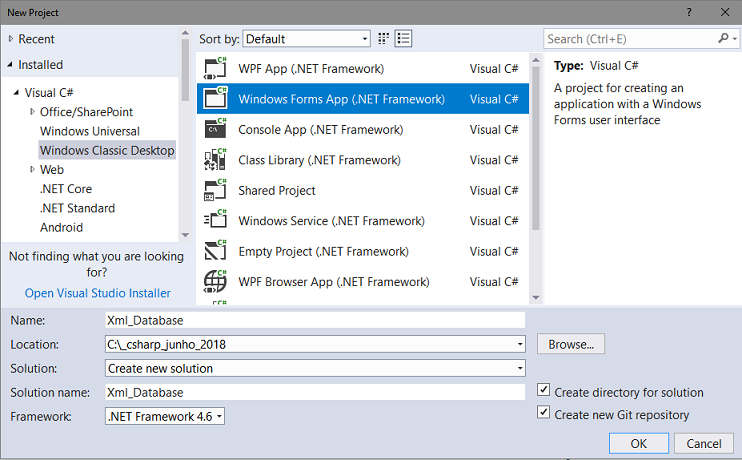 Abra o VS 2017 Community e crie um novo projeto do tipo Windows Forms com o nome Xml_Database: