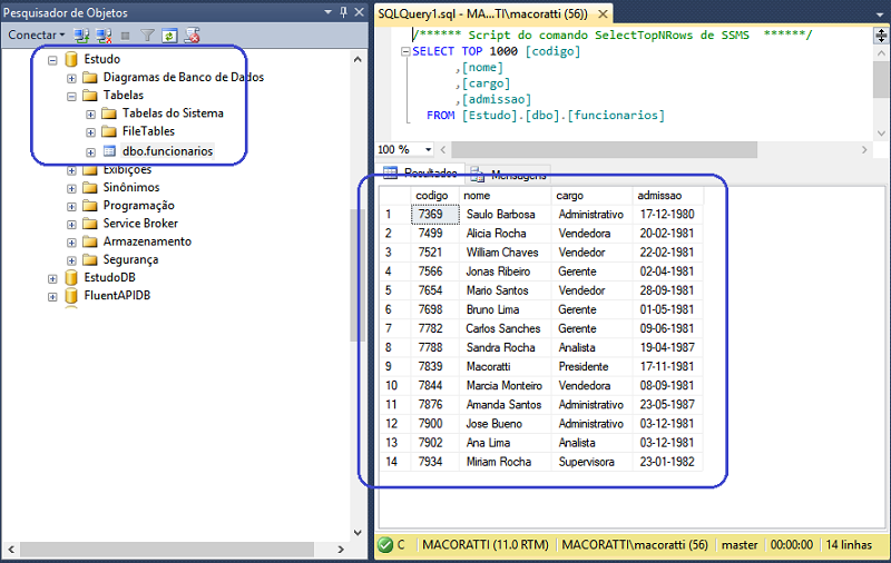 Verificando no SQL Server o banco de dados Estudo, vemos a tabela funcionarios gerada com os dados obtidos do arquivo XML, conforme figura abaixo:
