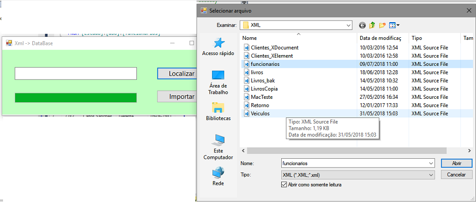 O código acima abre uma caixa de diálogo para selecionar o arquivo XML e atribui o nome à caixa de texto : txtArquivo no formulário.