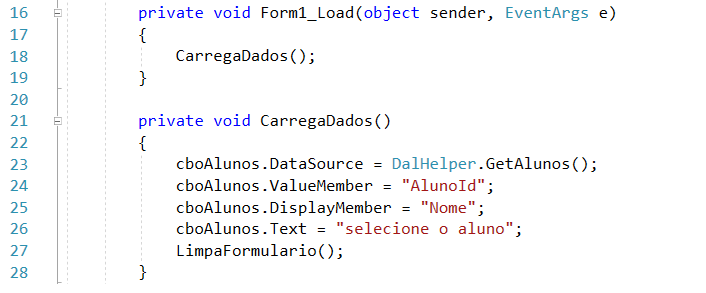 No evento Load do formulário vamos chamar o método CarregaDados() para preencher o combobox com os nomes dos alunos: