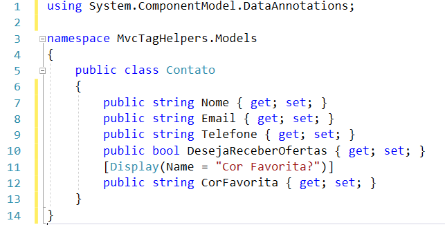 Usamos o recurso Data Annotations para definir um nome de exibição. Assim como os HTML Helpers, as tag Helpers podem usar essas informações para renderizar o formulário.