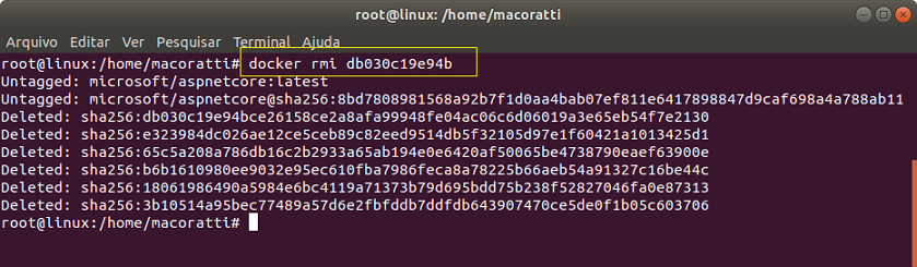 Vamos apagar a imagem microsoft/aspnetcore identificada pelo IMAGE ID db030c19e94b :