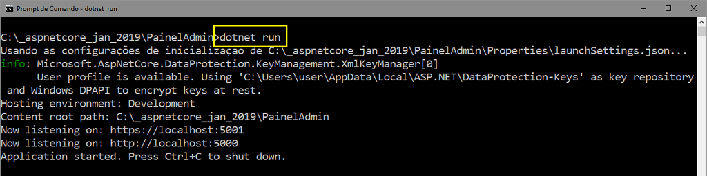No exemplo deste artigo eu crie a pasta c:\_aspncore_jan_2019 e dentro desta pasta criei a pasta PainelAdmin e a seguir entrei nesta pasta: