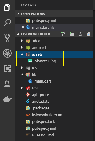 Como vamos exibir uma imagem local - planeta1.jpg - em nossa aplicação precisamos criar uma pasta assets na raiz do projeto e copiar a imagem que vamos exibir para esta pasta.(voce pode usar qualquer nome de pasta)