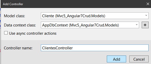 Após clicar no botão Add, nosso controlador ClientesController será criado na pasta Controllers.