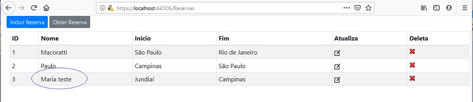 Executando o projeto, para deletar uma reserva basta clicar no ícone na coluna Deleta.