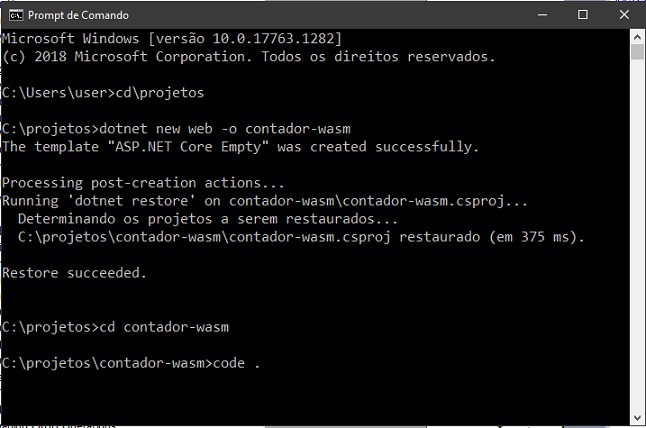 Isso vai criar um projeto ASP .NET Core Web vazio na dentro da pasta contador-wasm: