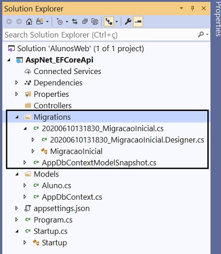 Note que é criada uma pasta Migrations no projeto contendo os arquivos de migração: