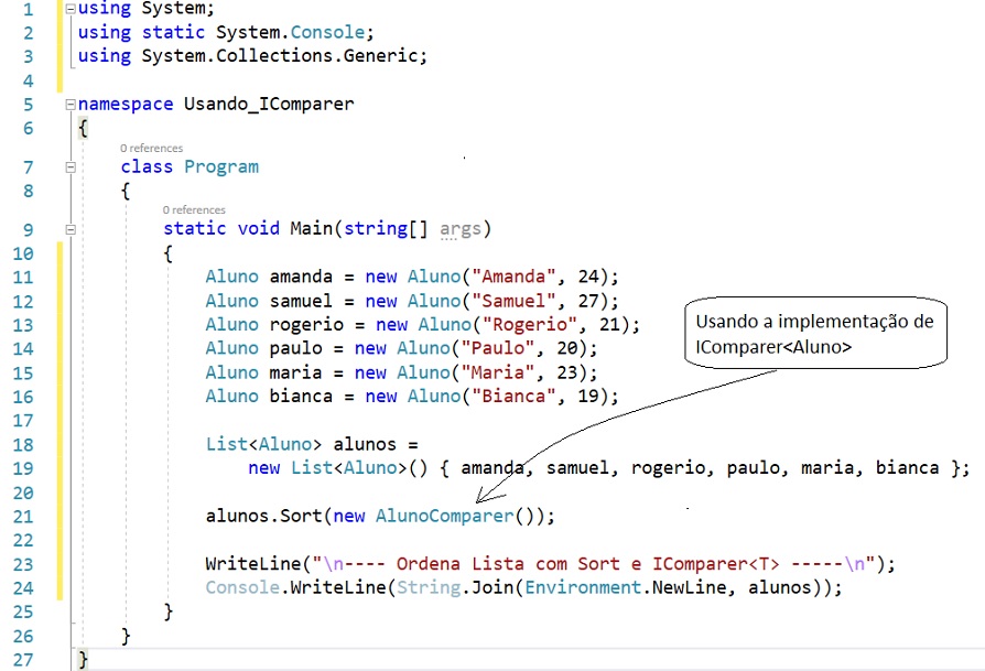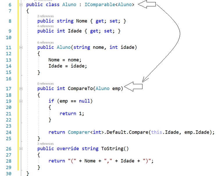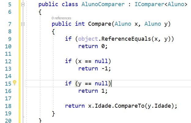 Com base nisso criamos a classe AlunoComparer que implementa a interface IComparer<Aluno> :