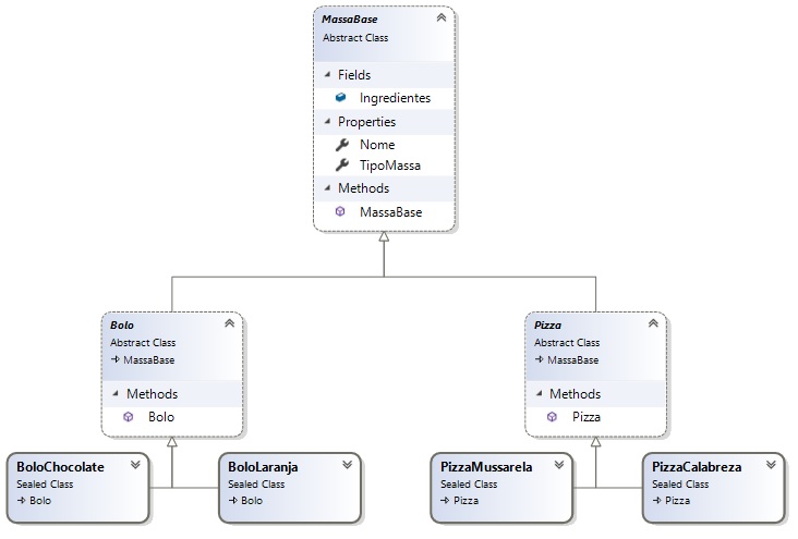 Como temos duas famílias de objetos que desejamos criar, Pizza e Bolo, vamos criar uma classe abstrata MassaBase da qual Bolo e Pizza vão herdar: