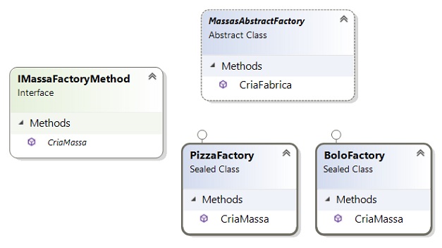 Vamos agora criar a classe abstrata MassasAbstractFactory onde vamos definir um método que vai ser do tipo de uma interface IMassaFactoryMethod que com base no tipo de massa : bolo ou pizza, vai criar uma instância da fábrica que sabe criar pizzas e bolos.