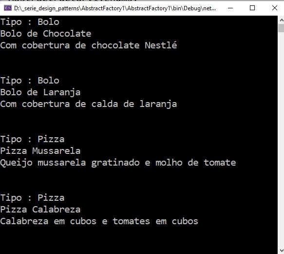 using AbstractFactory1.Enums; using System; namespace AbstractFactory1 //cria os objetos com base no tipo : bolo //cria os objetos com base no tipo : pizza //exibe os detalhes Console.ReadLine(); private static void ExibeDetalhes(MassaBase massaBase) |
