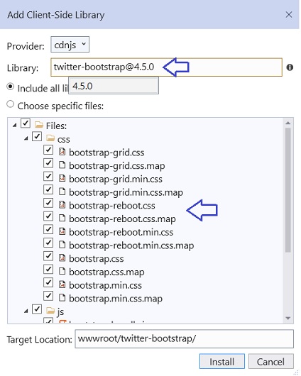 Teremos uma nova janela chamada Add Client-Side Library, aqui pesquise twitter-bootstrap na caixa de texto da biblioteca e clique no botão Instalar.