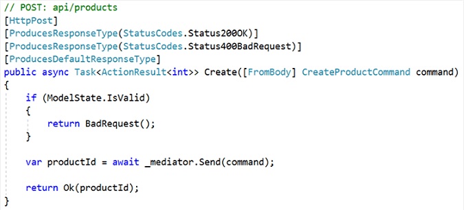 No exemplo acima, temos um mau exemplo de validação, pois a validação ModelState(do estado do modelo) é usada para garantir que a solicitação seja validada antes de ser enviada usando MediatR.