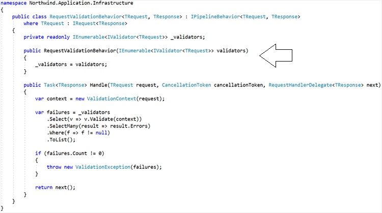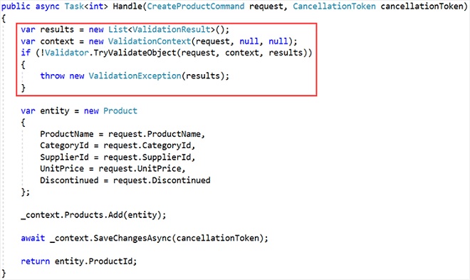 Felizmente, se você está seguindo nossas recomendações e combinando CQRS com MediatR, você pode resolver este problema incorporando o código que usa a classe RequestValidationBehavior: