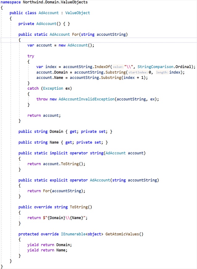 Aqui o tipo AdAccount deverá ser baseado no tipo ValueObject e a seguir temos uma implementação de exemplo para AdAccount: