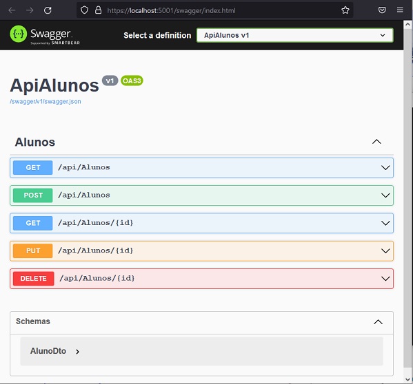 namespace ApiAlunos.Controllers [HttpGet("{id}", Name = "GetAluno")] [HttpPost] await _alunoService.CreateAsync(alunoDto); return new CreatedAtRouteResult("GetAluno", [HttpPut("{id}")] if (alunoDto == null) await _alunoService.UpdateAsync(id, alunoDto); return Ok(alunoDto); [HttpDelete("{id}")] if (alunoDto == null) await _alunoService.DeleteAsync(id); return Ok(alunoDto); |
