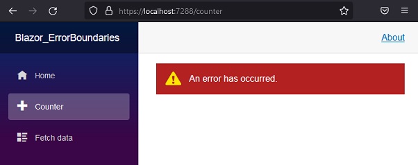 Por padrão, o componente ErrorBoundary renderiza um elemento <div> vazio com a classe CSS blazor-error-boundary para seu conteúdo de erro. As cores, o texto e o ícone da IU padrão são definidos usando CSS na folha de estilo do aplicativo na pasta wwwroot, portanto, você está livre para personalizar a IU de erro.