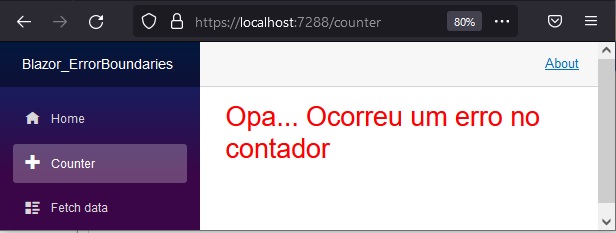 Como definimos o componente ErrorBoundary no layout a exibição da UI do erro será vista independentemente da página para a qual o usuário navegou. Dessa forma recomenda-se definir limites de erro de escopo restrito na maioria dos cenários. Se você definir um escopo amplo de um limite de erro, poderá redefini-lo para um estado sem erro em eventos de navegação de página subsequentes chamando o método Recover do limite de erro.
