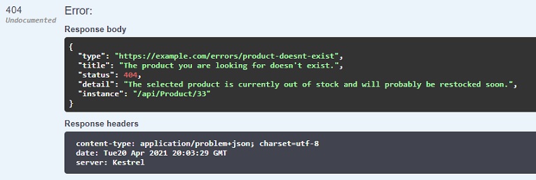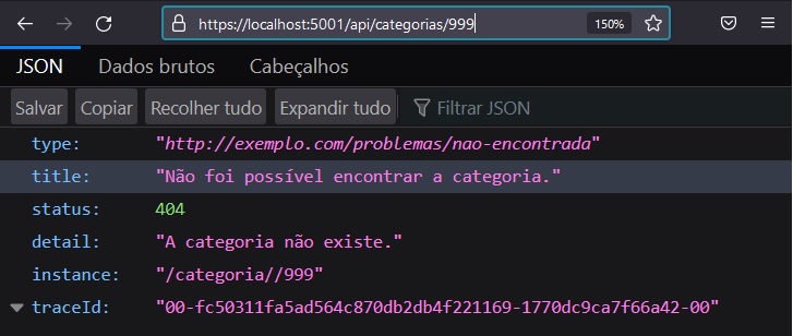 Vejamos um exemplo de uma resposta formatada usando o objeto ProblemDetails: