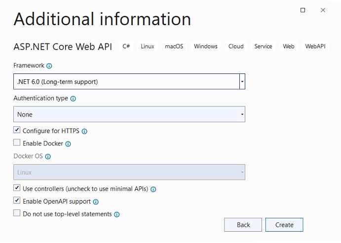 Crie um novo projeto ASP .NET Core Web API chamado RefitApi usando as configurações a seguir:
