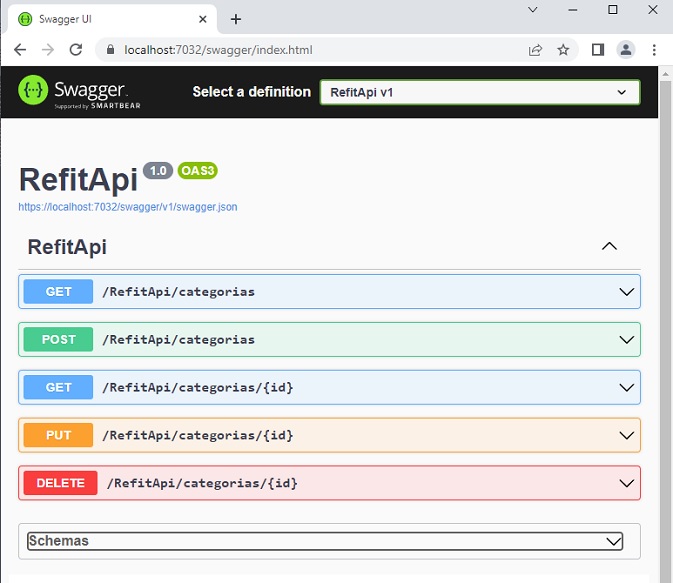 using Refit; using RefitApi.Models; namespace RefitApi.Services; public interface ICategoriaRefitService [Get("/api/1/categorias/{id}")] [Post("/api/1/categorias")] [Put("/api/1/categorias/{id}")] [Delete("/api/1/categorias/{id}")] |