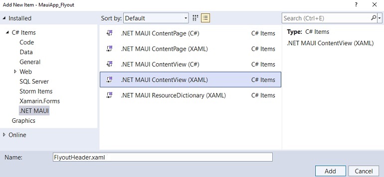 A seguir vamos criar 2 Views do tipo .NET MAUI ContentView(XAML):