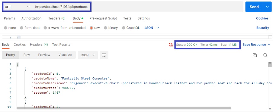 Abriando o Postman e enviando um request GET para https://localhost:7197/api/produtos teremos o seguinte resultado: