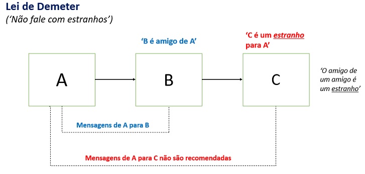 Por exemplo, se uma classe A precisa acessar um objeto da classe B, ela não deve chamar um método da classe B diretamente, mas sim chamar um método de um objeto intermediário que ela já conhece e que por sua vez conhece o objeto da classe B.