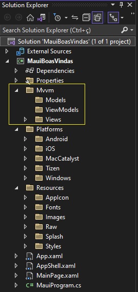 Vamos criar no projeto a pasta Mvvm e nesta pasta vamos criar as pastas : Views, Models e ViewModels para organizar o código que iremos criar.