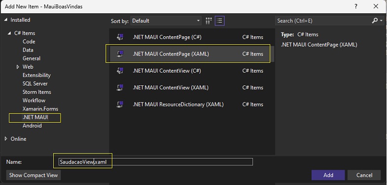 Selecione .NET MAUI e o template .NET MAUI ContentPage(XAML), informe o nome e clique em Add;