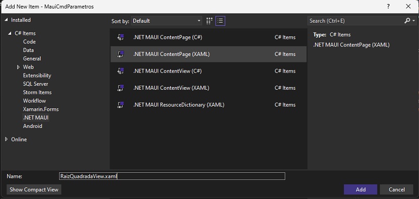 Selecione .NET MAUI e o template .NET MAUI ContentPage(XAML), informe o nome e clique em Add;
