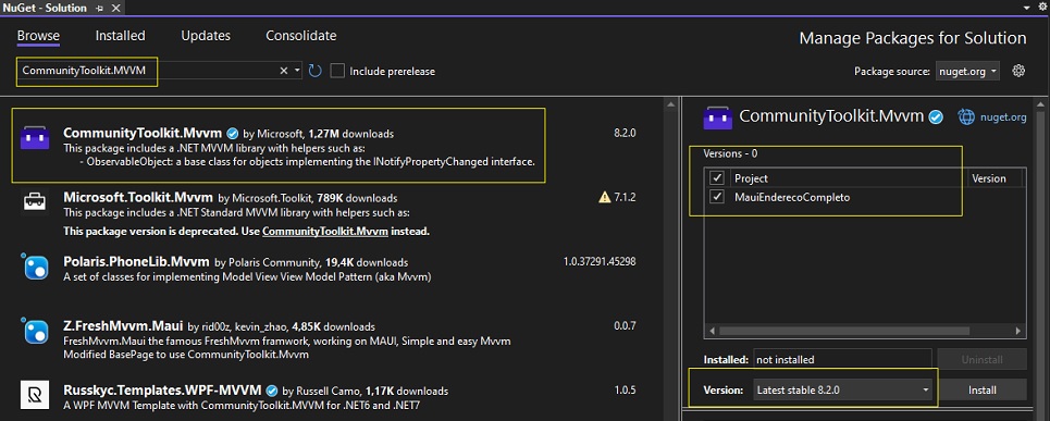 A primeira coisa a fazer é instalar o pacote nuger CommunityToolkit.MVVM no projeto .NET MAUI.