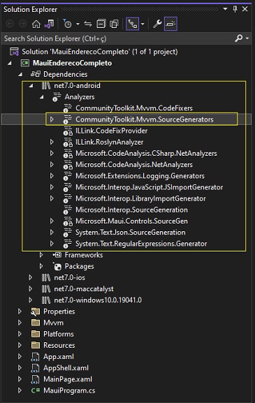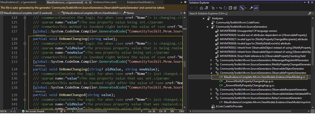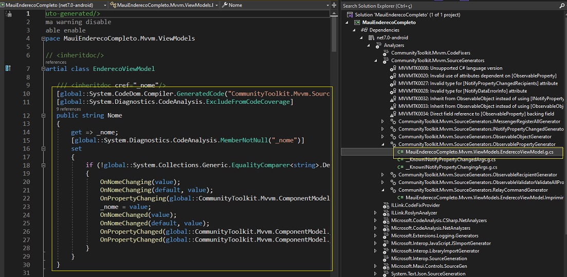 Podemos encontrar os arquivos gerados automaticamente (que sempre terminam em .g.cs) para nosso projeto no Solution Explorer em Dependencies -> net7.0 -> Analyzers -> CommunityToolkit.Mvvm.SourceGenerators.
