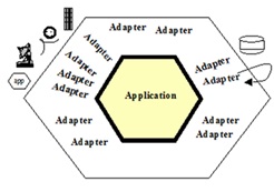 Assim, na aplicação, temos as portas que atuam como tomadas, com interfaces bem definidas e cada região possui adaptadores que conectam o mundo externo à aplicação.