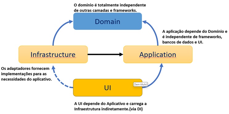- A UI depende do Aplicativo e carrega a Infraestrutura indiretamente.