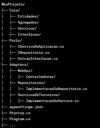 Vejamos agora uma sugestão de como estruturar uma aplicação ASP.NET Core Web API com base nos componentes da arquitetura hexagonal, como mencionado anteriormente.
