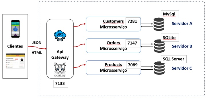 A figura a seguir ilustra o funcionamento da aplicação e da API Gateway implementada usando o OCELOT :
