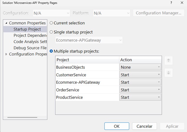 Para executar o projeto devemos configurar o modo Multiple startup projects conforme abaixo: