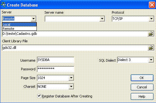 Indique as opções conforme a figura ao lado: Server : Informe Local DataBase : o nome e localização do banco de dados a ser criado UserName : informe SYSDBA Password : informe masterkey SQL : Informe Dialect 3 nota : a extensão .gdb indica um arquivo no formato Interbase ; a extensão .fdb indica o formato FireBird. |